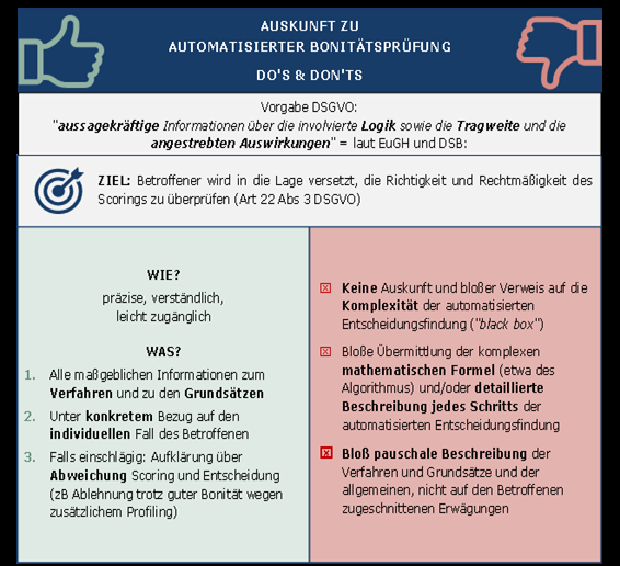 Kürzlich nahm der EuGH nun auch zum Umfang der Auskunftspflicht zu automatisierten Bonitätsprüfungen Stellung (C-203/22). Die Datenschutzbehörde veröffentlichte auf dieser Grundlage ein Rundschreiben. Damit wird der Maßstab für eine DSGVO-konforme Auskunftserteilung (noch) höher: Die Übermittlung des konkreten Score-Werts mit der generischen Aussage, dass bestimmte soziodemographische Daten "untereinander gleichwertig gewichtet" wurden, reicht nämlich nicht mehr aus Vielmehr ist – schematisch dargestellt – wie folgt vorzugehen: