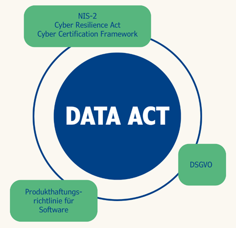 Der Data Act tritt neben bestehende und künftige Regularien hinzu. Daher sind zahlreiche potenzielle Spannungsverhältnisse und Wechselwirkungen gesamthaft zu berücksichtigen. Sind neben produktgenerierten Daten auch personenbezogene betroffen, gilt auch die DSGVO. Daneben sind auch die diversen Cybersicherheits- und Produkthaftungsvorschriften zu berücksichtigen. Auch daraus können sich Wechselwirkungen ergeben: Insbesondere muss der Datenzugang (Access by Design) für den Nutzer (cyber-)sicher ausgestaltet sein und künftig unter anderem die Anforderungen des Cyber Resilience Act erfüllen müssen.