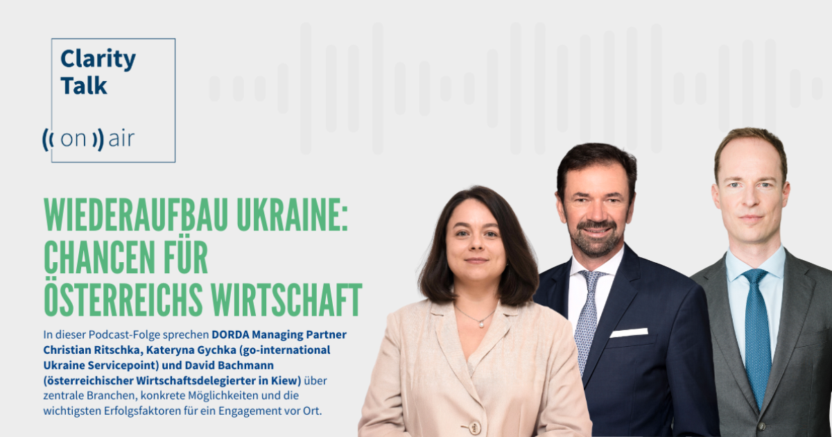 Der Wiederaufbau der Ukraine wird eine der zentralen wirtschaftlichen und gesellschaftlichen Aufgaben der kommenden Jahre sein. Bereits heute entwickeln internationale Partner und die Europäische Union Strategien und Initiativen, um den Wiederaufbau langfristig zu unterstützen und neue Perspektiven zu eröffnen. In dieser Podcast-Folge spricht DORDA-Managing Partner Christian Ritschka mit Kateryna Gychka, Projektmanagerin beim go-international Ukraine Servicepoint, und David Bachmann, österreichischer Wirtschaftsdelegierter in Kiew, über die Rolle von und Möglichkeiten österreichischer Unternehmen im Wiederaufbauprozess. Gemeinsam beleuchten sie, welche Sektoren künftig eine Schlüsselrolle spielen werden, welche Chancen sich ergeben und worauf es bei einem Engagement in der Ukraine besonders zu achten gilt.